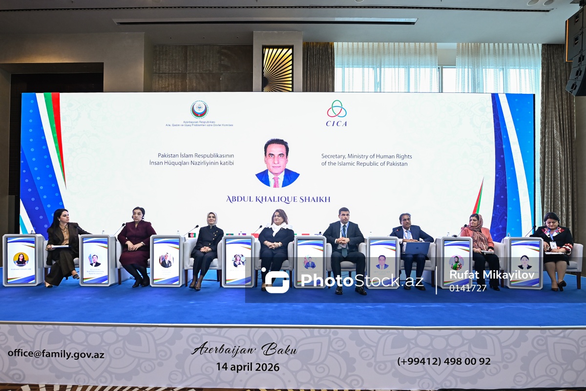 "AQEM məkanında davamlı inkişaf naminə qadınların səslərinin gücləndirilməsi" mövzusunda beynəlxalq konfransdakı "Kiçik və orta bizneslərdə (KOB) qadın sahibkarlar: süni intellekt və rəqəmsallaşmanın imkanlarından istifadə" adlı panel müzakirəsində iştirak edən (soldan-sağa) Azərbaycan Respublikasının Xarici İşlər Nazirliyinin Regional Təhlükəsizlik İdarəsinin şöbə müdiri Nərmin Ahəngari, Özbəkistan Respublikasının Baş nazirinin müavini, Ailə və Qadınlar Komitəsinin sədri Zulayxo Baxriddinovna Maxkamova, Türkiyə Respublikasının Ailə və Sosial Xidmətlər naziri Mahinur Özdemir Göktaş, Azərbaycan Respublikası Milli Məclisinin Ailə, qadın və uşaq məsələləri komitəsinin sədri Hicran Hüseynova, Azərbaycan Respublikasının Kiçik və Orta Biznesin İnkişafı Agentliyinin (KOBİA) İdarə Heyətinin sədri Orxan Məmmədov, Pakistan İslam Respublikasının İnsan Hüquqları Nazirliyinin katibi Abdul Xaliq Şeyx, "Women and Children Research and Advocacy Network" təşkilatının baş icraçı direktoru Zarqa Yaftali, Tacikistan Respublikası Hökuməti yanında Qadın və Ailə İşləri Komitəsi sədrinin müavini Zarina Abdulmaynzoda.