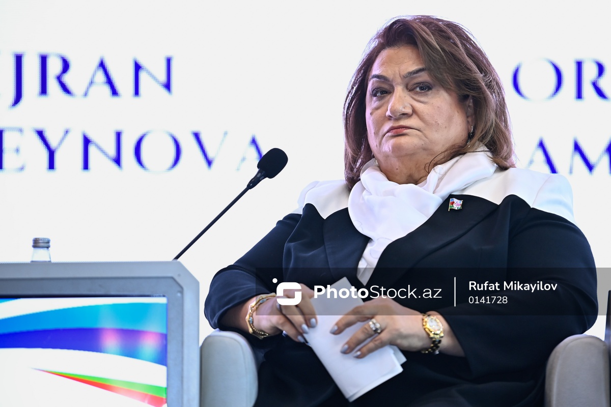 "AQEM məkanında davamlı inkişaf naminə qadınların səslərinin gücləndirilməsi" mövzusunda beynəlxalq konfransdakı "Kiçik və orta bizneslərdə (KOB) qadın sahibkarlar: süni intellekt və rəqəmsallaşmanın imkanlarından istifadə" adlı panel müzakirəsində çıxış edən Azərbaycan Respublikası Milli Məclisinin Ailə, qadın və uşaq məsələləri komitəsinin sədri Hicran Hüseynova.