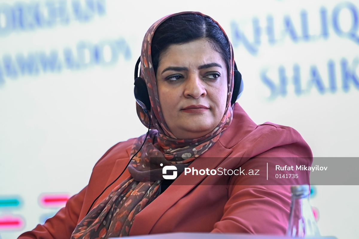 "AQEM məkanında davamlı inkişaf naminə qadınların səslərinin gücləndirilməsi" mövzusunda beynəlxalq konfransdakı "Kiçik və orta bizneslərdə (KOB) qadın sahibkarlar: süni intellekt və rəqəmsallaşmanın imkanlarından istifadə" adlı panel müzakirəsində çıxış edən "Women and Children Research and Advocacy Network" təşkilatının baş icraçı direktoru Zarqa Yaftali.