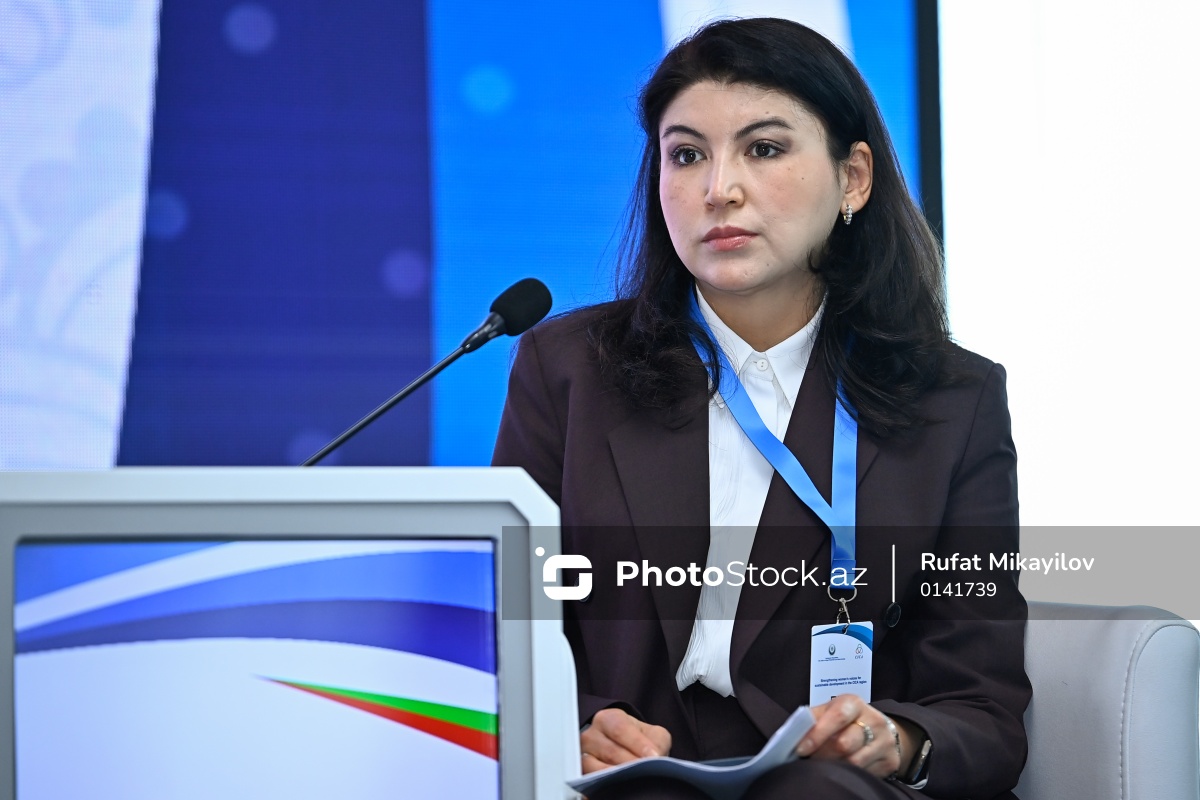 "AQEM məkanında davamlı inkişaf naminə qadınların səslərinin gücləndirilməsi" mövzusunda beynəlxalq konfransdakı "Ətraf mühitin qorunması və dayanıqlılığın artırılmasında qadın liderliyi" adlı panel müzakirəsində çıxış edən Özbəkistan Respublikasının Daşkənd şəhəri icra hakimiyyəti başçısının müavini, Ailə və Qadın İşləri üzrə Departamentin rəhbəri Şahnoza Sultanova.