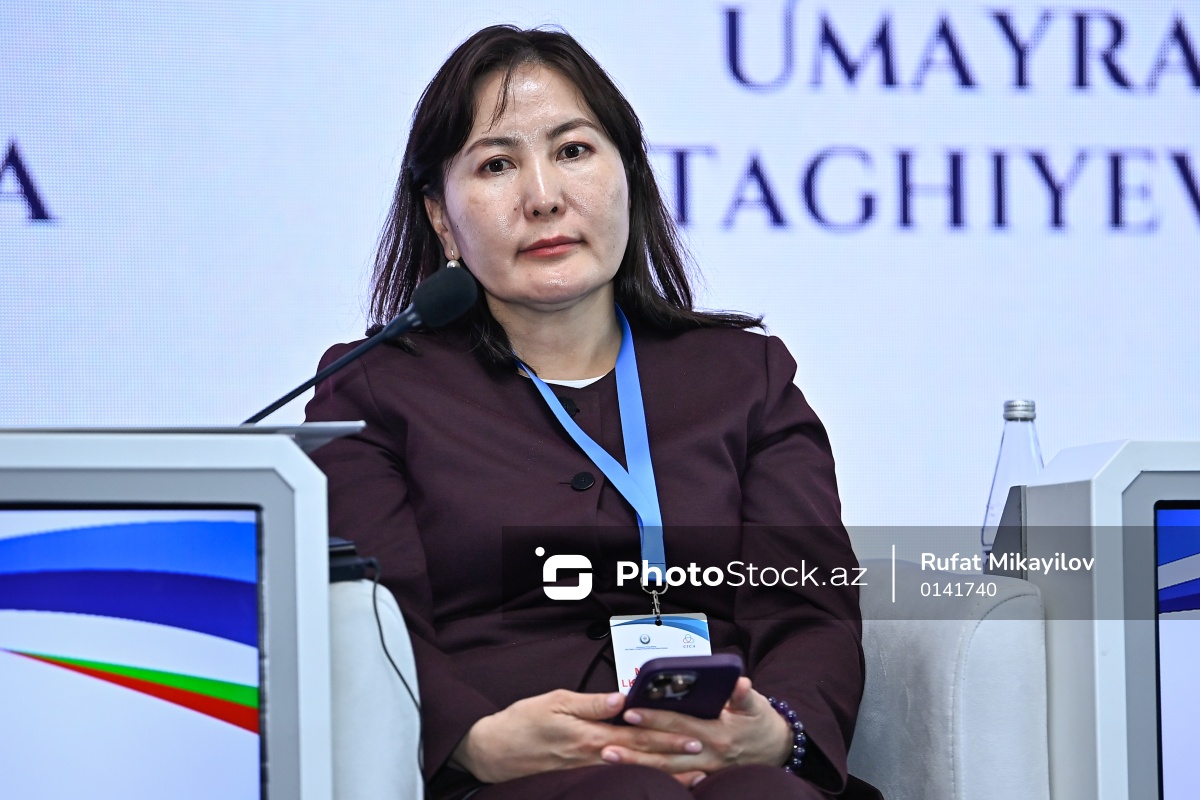 "AQEM məkanında davamlı inkişaf naminə qadınların səslərinin gücləndirilməsi" mövzusunda beynəlxalq konfransdakı "Ətraf mühitin qorunması və dayanıqlılığın artırılmasında qadın liderliyi" adlı panel müzakirəsində çıxış edən Monqolustan Respublikasının Ailə, Əmək və Sosial Müdafiə Nazirliyinin dövlət katibi Munkzul Lxaqvasuren.