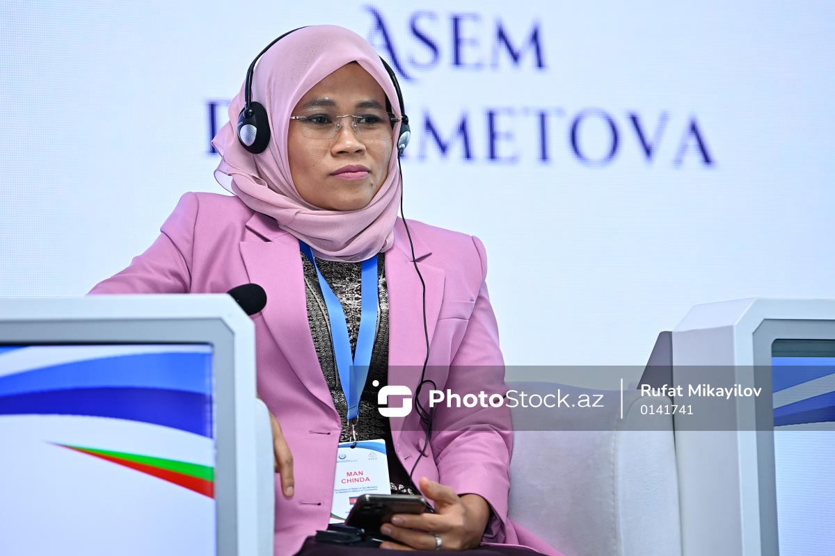 "AQEM məkanında davamlı inkişaf naminə qadınların səslərinin gücləndirilməsi" mövzusunda beynəlxalq konfransdakı "Ətraf mühitin qorunması və dayanıqlılığın artırılmasında qadın liderliyi" adlı panel müzakirəsində çıxış edən Kamboca Krallığının Qadın İşləri Nazirliyinin dövlət katibi Man Çinda.