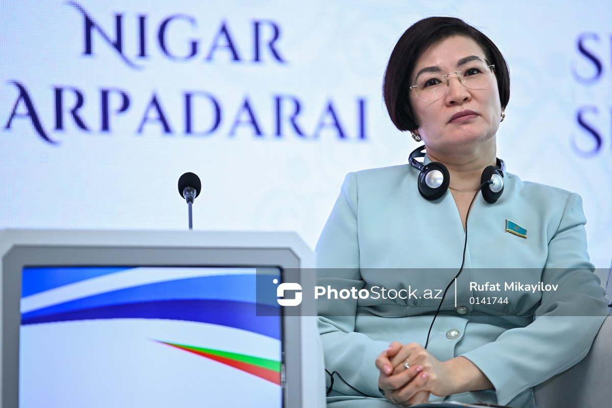 "AQEM məkanında davamlı inkişaf naminə qadınların səslərinin gücləndirilməsi" mövzusunda beynəlxalq konfransdakı "Ətraf mühitin qorunması və dayanıqlılığın artırılmasında qadın liderliyi" adlı panel müzakirəsində çıxış edən Qazaxıstan Respublikası Parlamentinin Senatının Sosial və Mədəni İnkişaf və Elm Komitəsinin üzvü Asem Raxmetova.