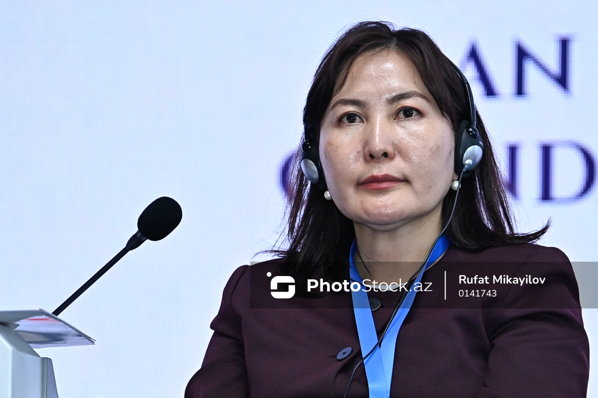 "AQEM məkanında davamlı inkişaf naminə qadınların səslərinin gücləndirilməsi" mövzusunda beynəlxalq konfransdakı "Ətraf mühitin qorunması və dayanıqlılığın artırılmasında qadın liderliyi" adlı panel müzakirəsində çıxış edən Monqolustan Respublikasının Ailə, Əmək və Sosial Müdafiə Nazirliyinin dövlət katibi Munkzul Lxaqvasuren.
