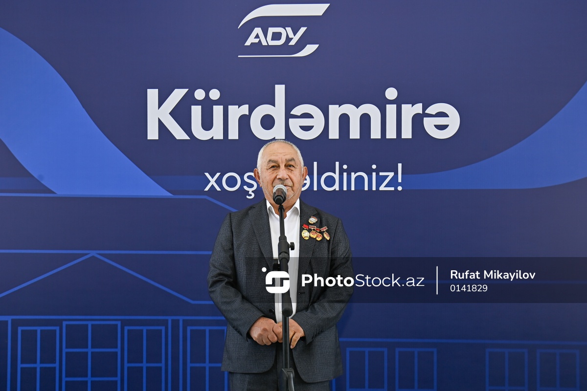 Yenidən qurulan Kürdəmir stansiyasının açılışında çıxış edən fəxri dəmiryolçu Alik Əliyev.