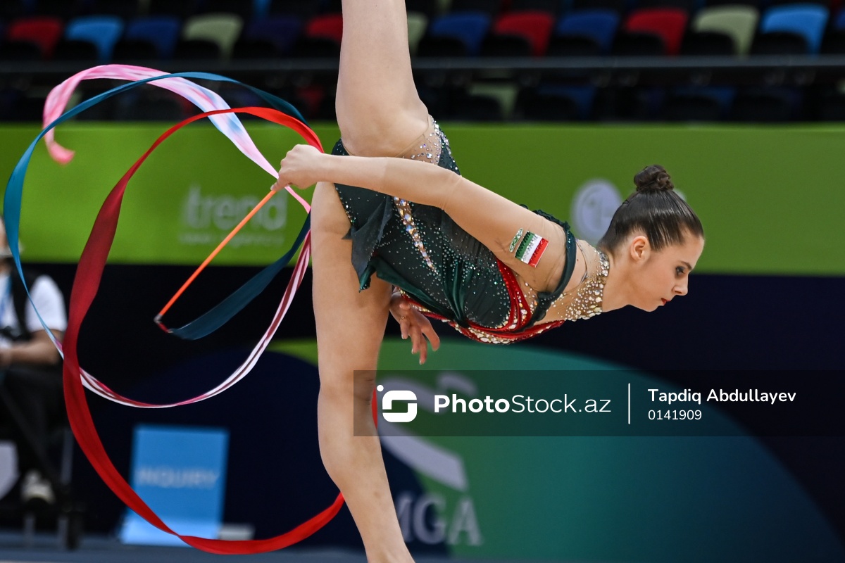Bakıda keçirilən bədii gimnastika üzrə Dünya kubokunda iştirak edən Macarıstan təmsilçisi Fanni Piqnitski.