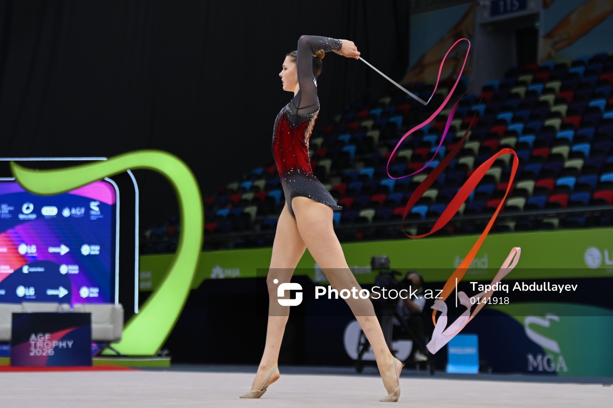 Bakıda keçirilən bədii gimnastika üzrə Dünya kubokunda iştirak edən Niderland təmsilçisi Noa Qabrielle Van Der Laan.