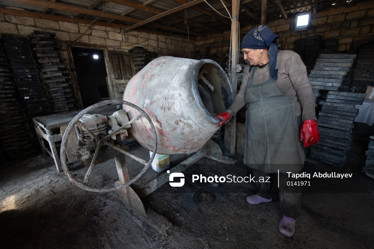 Bülbül Babayeva artıq 15 ildir ki, tamet daşları istehsal edən sexdə çalışır. Maddi ehtiyaclarını qarşılamaq üçün başladığı bu iş zamanla onun həyatının bir parçasına çevrilib. Ağır fiziki əməyə baxmayaraq, o illər keçdikcə işinə öyrəşdiyini və hər mərhələsini yaxşı mənimsədiyini deyir. Sexdə iş prosesi ardıcıl və diqqət tələb edən mərhələlərdən ibarətdir. Əvvəlcə qəliblər yağlanır ki, hazır məhsul asanlıqla çıxarılsın. Daha sonra palçıq xüsusi qurğuda qarışdırılır və hazır vəziyyətə gətirilir. Qarışıq qəliblərə doldurulduqdan sonra isə vibrasiya aparatı vasitəsilə sıxlaşdırılır və formaya salınır. Növbəti mərhələdə daşlar qurumağa buraxılır və tam sərtləşdikdən sonra istifadəyə hazır olur. Fiziki güc və incə dəqiqlik tələb edən bu sahə 65 yaşlı Bülbül Babayevanın gündəlik həyatının ayrılmaz hissəsinə çevrilib.
