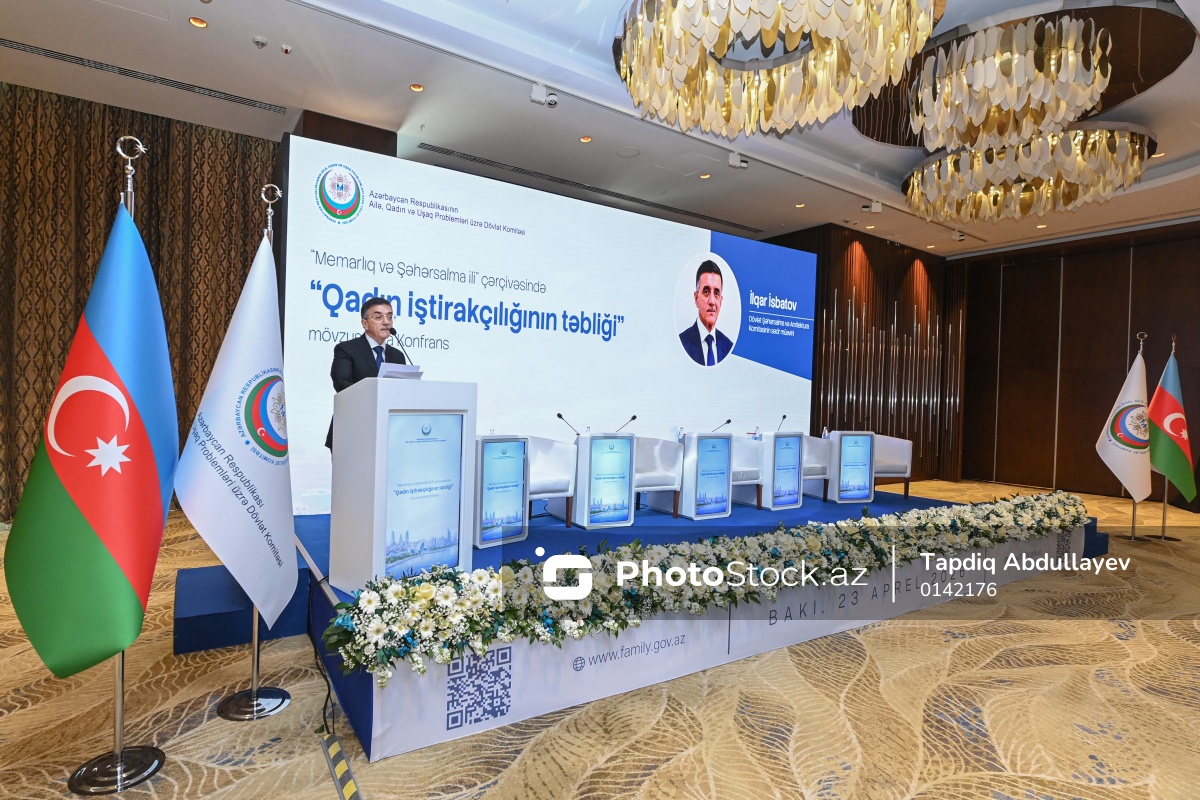 "Memarlıq və Şəhərsalma ili" çərçivəsində "Qadın iştirakçılığının təbliği" mövzusunda konfransda çıxış edən Dövlət Şəhərsalma və Arxitektura Komitəsinin sədr müavini İlqar İsbatov.