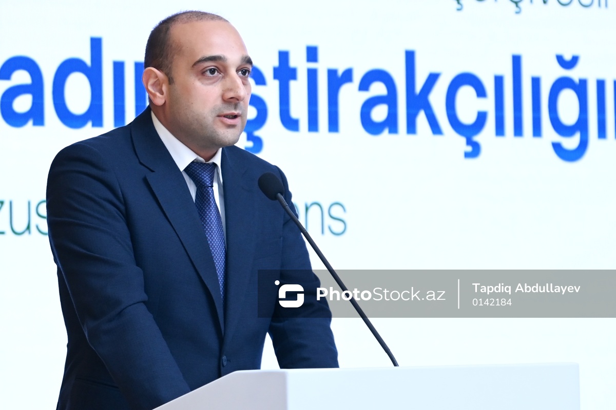 "Memarlıq və Şəhərsalma ili" çərçivəsində "Qadın iştirakçılığının təbliği" mövzusunda konfransda çıxış edən Kiçik və Orta Biznesin İnkişafı Agentliyinin İdarə Heyətinin sədr müavini Rüfət Atakişiyev.