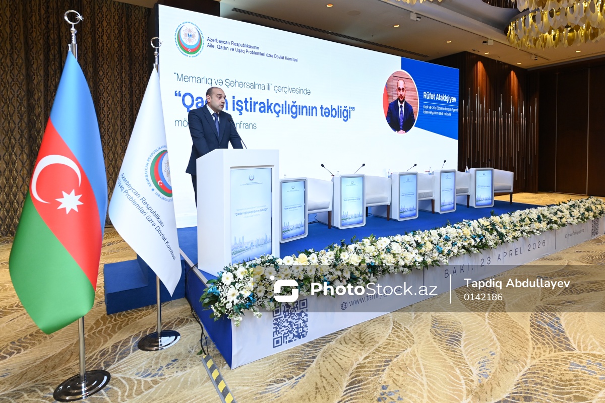 "Memarlıq və Şəhərsalma ili" çərçivəsində "Qadın iştirakçılığının təbliği" mövzusunda konfransda çıxış edən Kiçik və Orta Biznesin İnkişafı Agentliyinin İdarə Heyətinin sədr müavini Rüfət Atakişiyev.