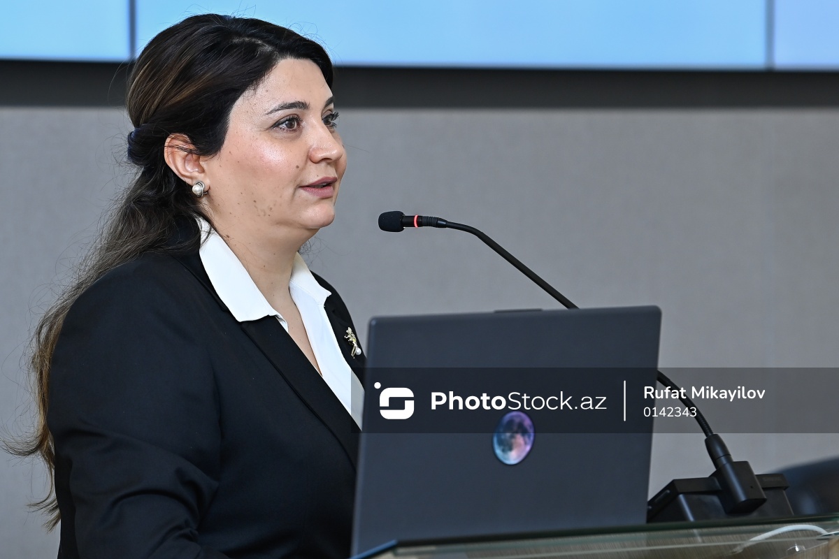 “Tam orta təhsil səviyyəsində xarici dil fənləri üzrə qiymətləndirmə: yeni yanaşmalar və perspektivlər” adlı tədbirdə çıxış edən Dövlət İmtahan Mərkəzinin Dövlət dili və xarici dillər üzrə şöbəsinin müdiri Könül Hacıyeva.