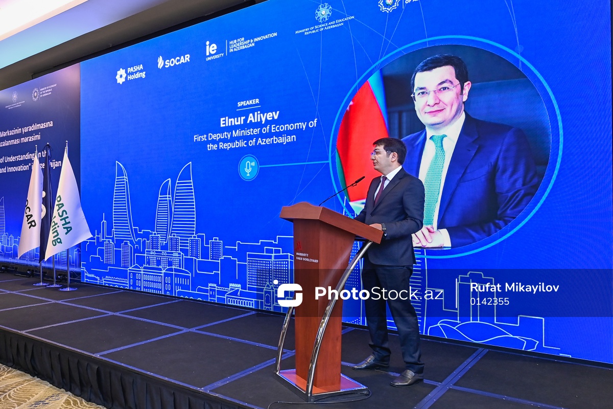 Bakıda Liderlik və İnnovasiya üzrə IE Mərkəzinin yaradılması üzrə Anlaşma Memorandumunun imzalanma mərasimində çıxış edən Azərbaycan Respublikasının iqtisadiyyat nazirinin birinci müavini Elnur Əliyev.