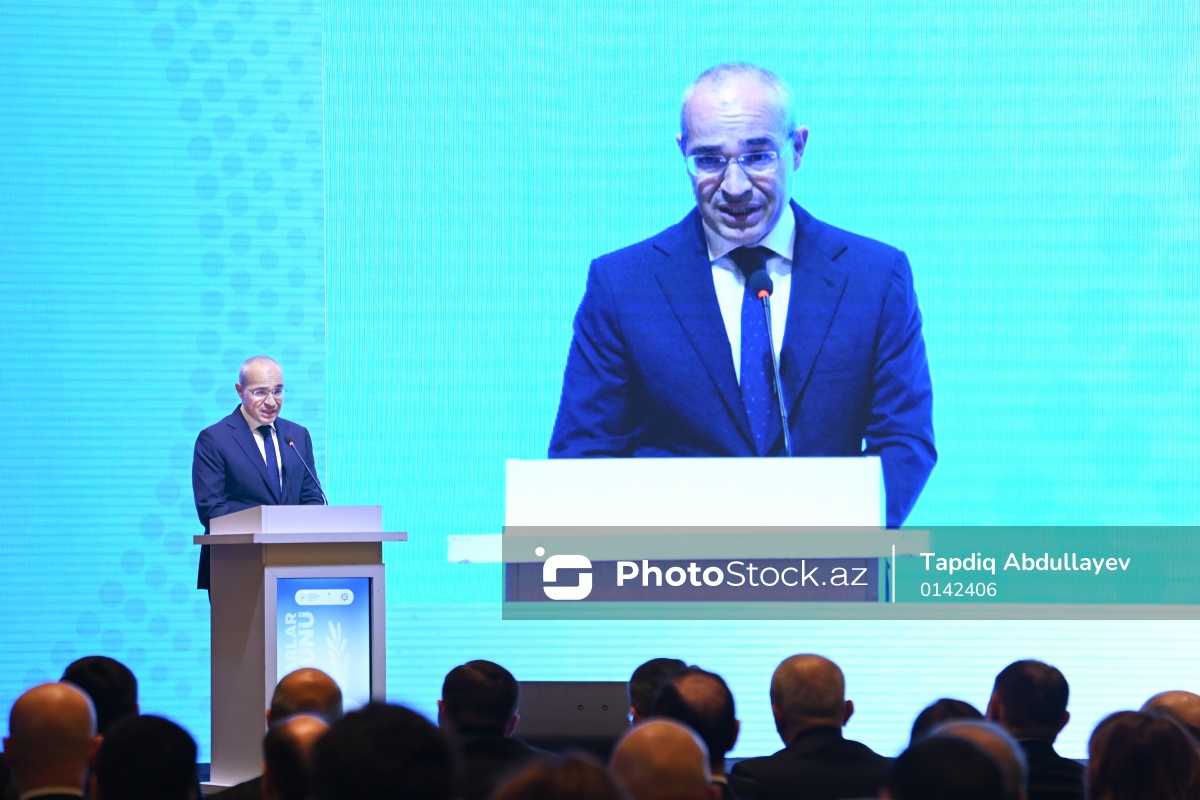 "Sahibkarlığın inkişafı güclü iqtisadiyyatdır" adlı tədbirdə çıxış edən Azərbaycan Respublikasının iqtisadiyyat naziri Mikayıl Cabbarov.