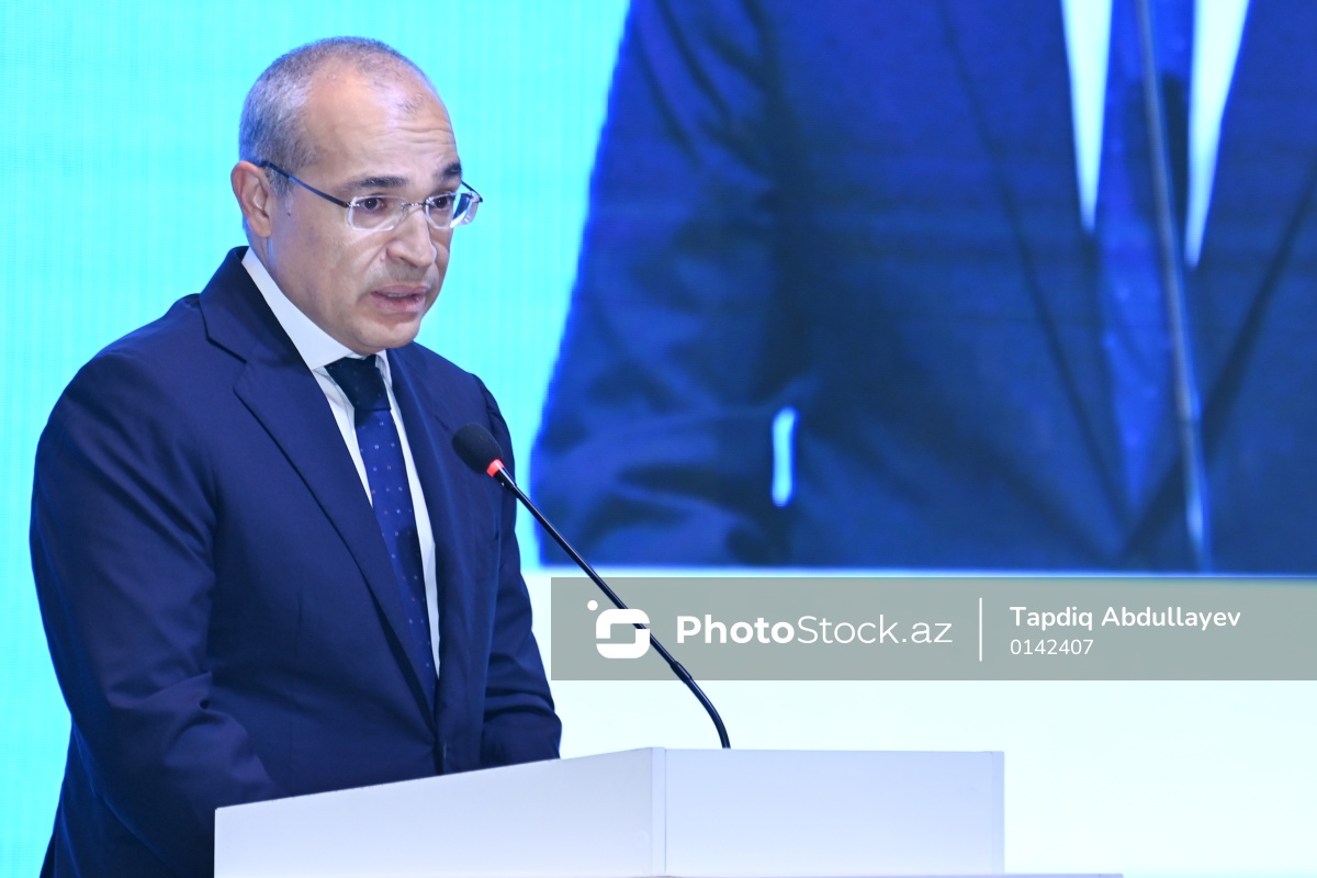 "Sahibkarlığın inkişafı güclü iqtisadiyyatdır" adlı tədbirdə çıxış edən Azərbaycan Respublikasının iqtisadiyyat naziri Mikayıl Cabbarov.