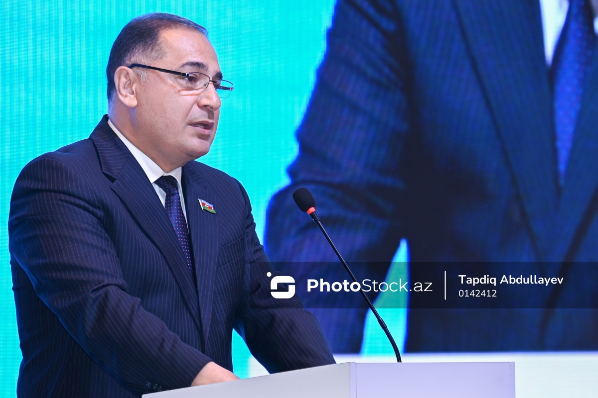 "Sahibkarlığın inkişafı güclü iqtisadiyyatdır" adlı tədbirdə çıxış edən Azərbaycan Respublikası Milli Məclisinin İqtisadi siyasət, sənaye və sahibkarlıq komitəsinin sədri, millət vəkili Azər Əmiraslanov.