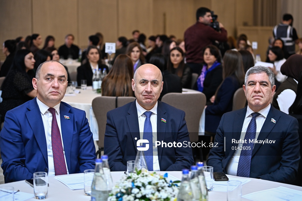 "Dayanıqlı inkişaf: ailə, qadın və uşaq siyasəti" mövzusunda keçirilən konfransda iştirak edən (soldan-sağa) Azərbaycan Respublikasının Milli Məclisinin deputatları Ceyhun Məmmədov, Azər Badamov və Vüqar Bayramov.