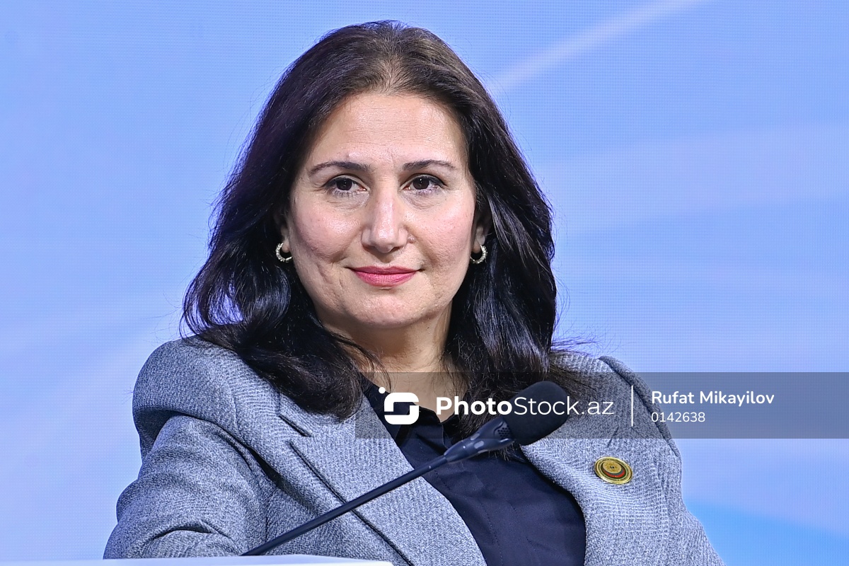 "Dayanıqlı inkişaf: ailə, qadın və uşaq siyasəti" mövzusunda keçirilən konfransda çıxış edən Azərbaycan Respublikasının Ailə, Qadın və Uşaq Problemləri üzrə Dövlət Komitəsinin Hüquqi təminat şöbəsinin müdiri Taliyə İbrahimova.