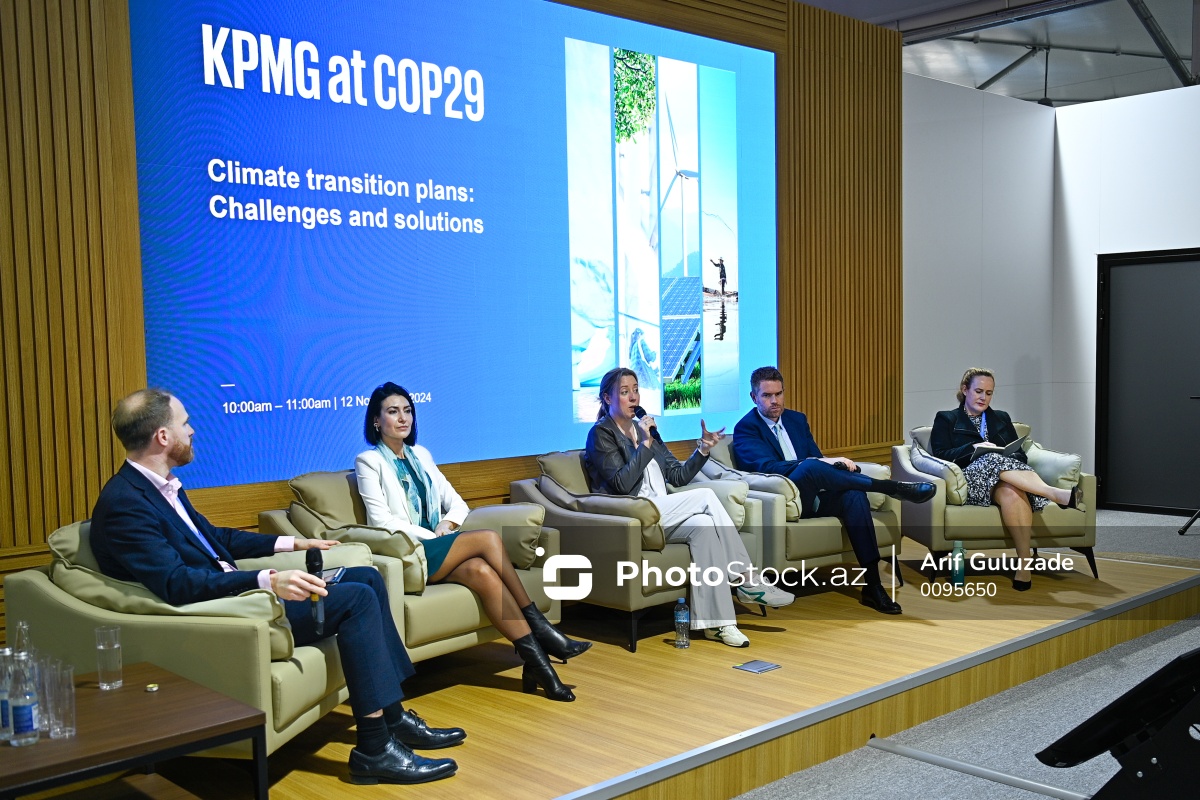 “İqlim keçidi planları: çətinliklər və həll yolları” mövzusunda keçirilən panel müzakirəsində iştirak edən (soldan-sağa) KPMG nümayəndəsi Simon Weaver, Kembric Davamlı İnkişaf İnstitutunun (CISL) baş layihə meneceri Svetelina Kuzmanova, Aon-da İqlim Riski Məsləhətinin Qlobal Rəhbəri Elizabeth Henderson, JP Morgan İcraçı Direktoru, Davamlılıq və Ətraf Mühit, Sosial və Korporativ İdarəetmə Departamentinin rəhbəri Luke Nelson və Beynəlxalq Dayanıqlılıq Standartları Şurasının (ISSB) Strateji Məsələlər və Bacarıqların İnkişafı şöbəsinin rəhbəri Mardi MakBrayen.