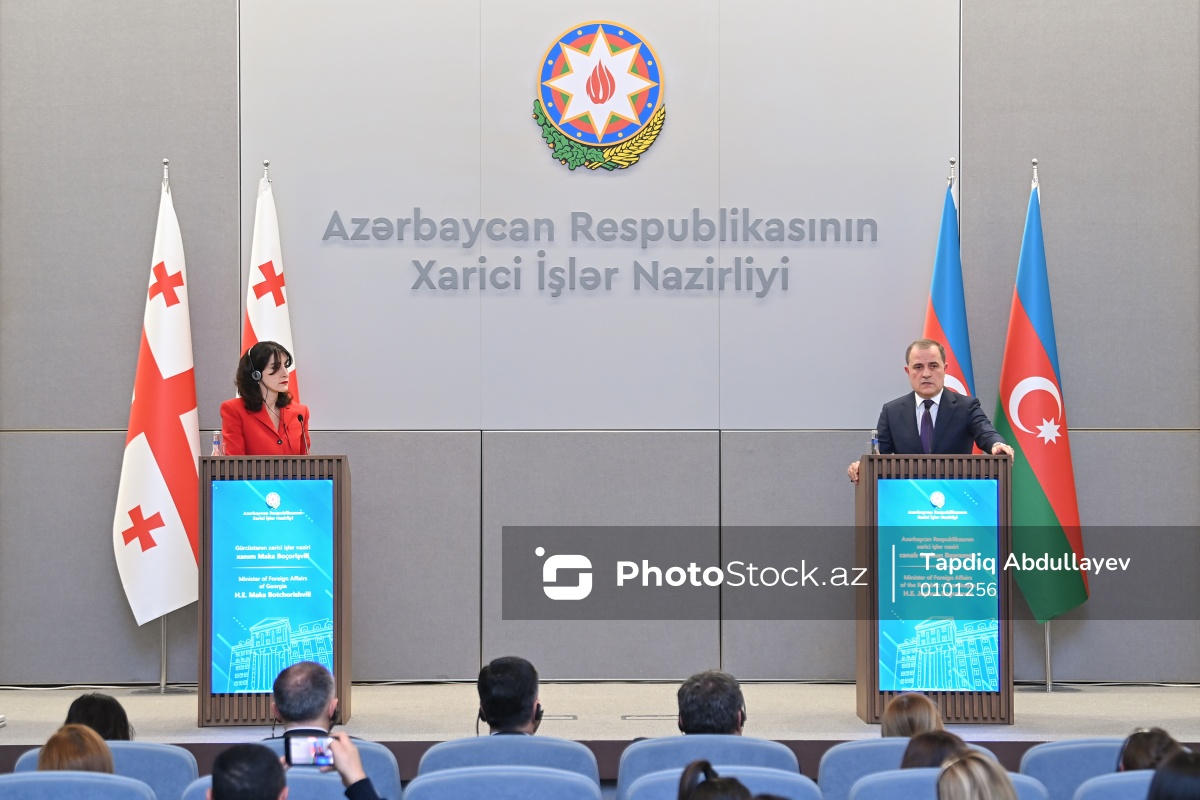 Gürcüstanın xarici işlər naziri Maka Boçorişvili (sol), Azərbaycanın xarici işlər naziri Ceyhun Bayramov (sağ).